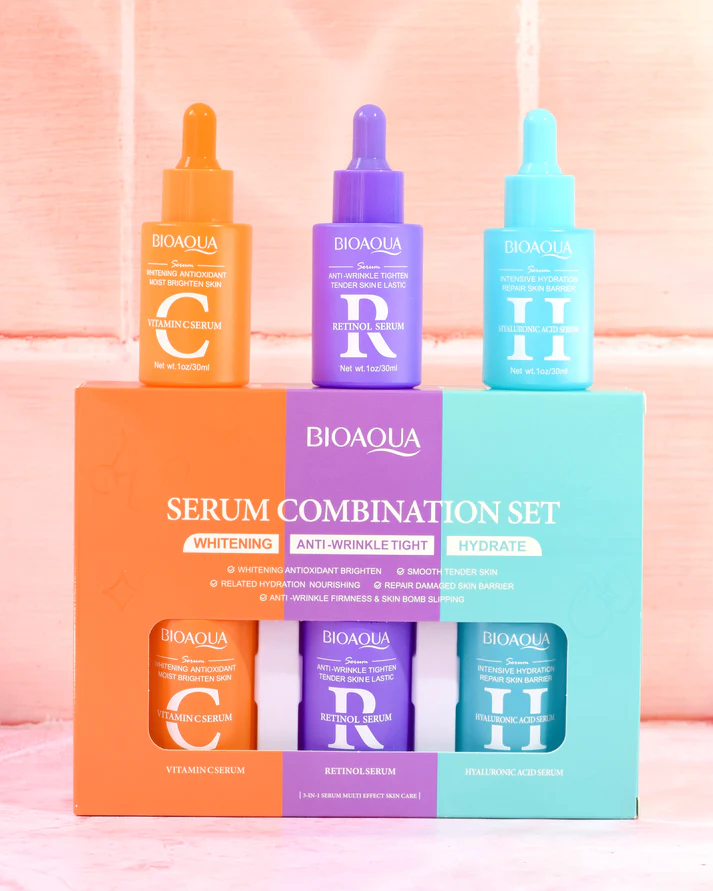 Este combo de 3 sueros faciales de 30 ml cada uno, es perfecto para hidratar, rejuvenecer y proteger tu piel todos los días. Incluye: